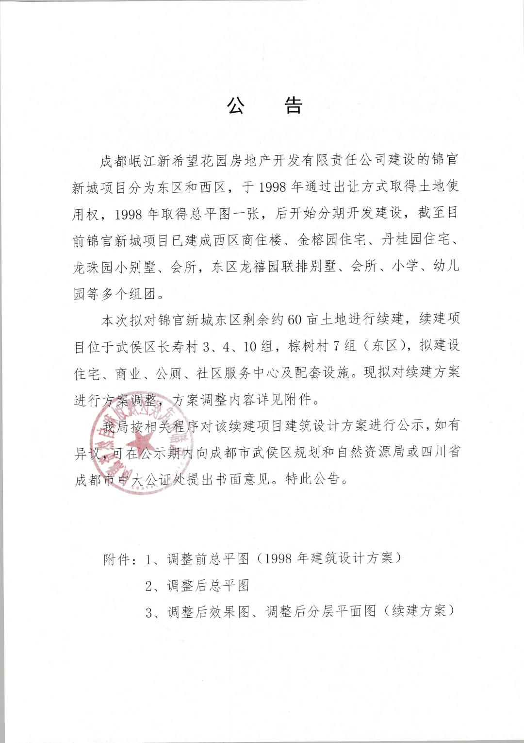 成都岷江新希望花园房地产开发有限责任公司建设的锦官新城项目分为东区和西区,于1998年通过出让方式取得土地使用权,1998年取得总平图一张,后开始分期开发建设,截至目前锦官新城项目已建成西区商住楼、金榕园住宅、丹桂园住宅:龙珠园小别墅、会所,东区龙禧园联排别墅、会所、小学、幼儿园等多个组团。