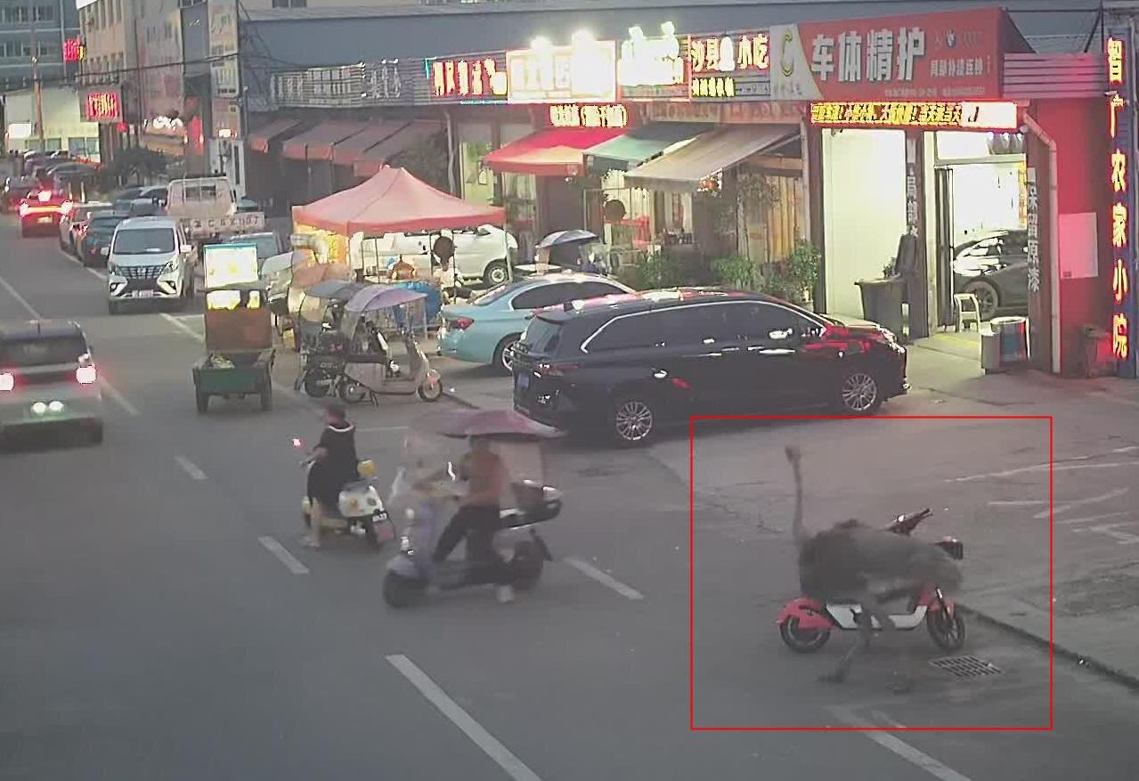 记者在监控画面中看到,这只鸵鸟“慢跑”在非机动车道上,其身边是来往的汽车和电动车。“不遵守交通”的它,还会时不时地“突然变道”,让后方驾驶员惊出一身冷汗。