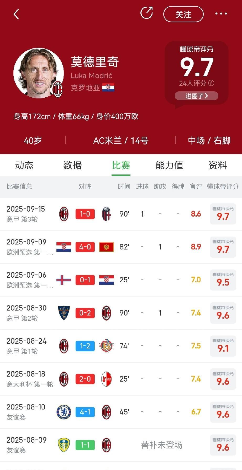 这莫德里奇哪里是来养老的,是来被啃老的,现在连休息的时间都没有。 不得不说魔笛就是现代典型中场大师的教科书。目前依然拥有着世一中的表现。 他的覆盖真的是打破对技术性中场的固有认知,而且他4、6、8、10号位全能踢。 给人的印象就是:摆脱能力强+传球组织强+跑不死。 40岁的人还能在五大联赛有这么好的表现,真的太不可思议了。