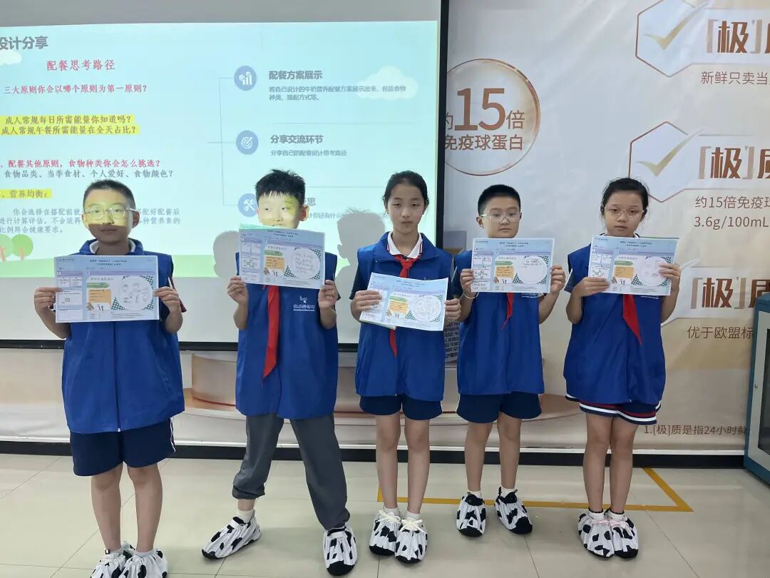 在实践任务环节,同学们化身“小小营养师”,完成“家庭营养午餐设计”的挑战任务。他们需要运用膳食营养知识,从营养餐标准出发,考量家庭饮食喜好,绘制搭配图,精准标注能量值及蛋白质、碳水化合物等核心营养素。有的同学设计了“高钙套餐”,注重奶制品与豆制品的科学搭配;有的同学关注“蛋白质均衡”,合理配置动植物蛋白比例;还有同学考虑到膳食纤维摄入,精心搭配蔬菜与粗粮。该任务让学生实现了从知识理解到生活应用的跨越,还锻炼了他们的营养学应用能力和实践创新能力。