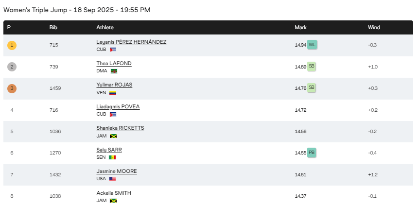 巴黎奥运冠军、多米尼克选手拉丰最后一跳14米89的赛季最佳获得银牌,四届世锦赛冠军、委内瑞拉选手罗哈斯复出后的首场决赛跳出14米76的赛季最佳,获得一枚铜牌。