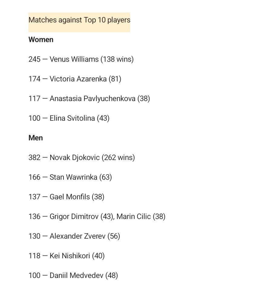 记者OlegS.(网球)发推特报道,随机数据统计。对阵保利尼的比赛是斯维托丽娜职业生涯第100次迎战TOP10选手,她也是现役WTA球员中四位达成此成就的选手之一。