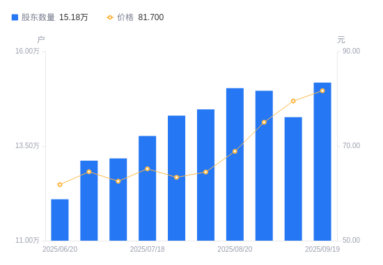 日期A股户数(户)流通A股户均持股数(股)户均持股市值(万元)2025-09-1915176915571.19127.222025-09-1014262916569.03131.762025-08-2914961815783.71118.432025-08-2015028115714.08108.242025-08-0814471316318.37105.272025-07-3114303316509.66104.652025-07-1813765417154.79111.832025-07-1013173117926.12112.152025-06-3013115018005.53116.262025-06-2012092719743.29122.11