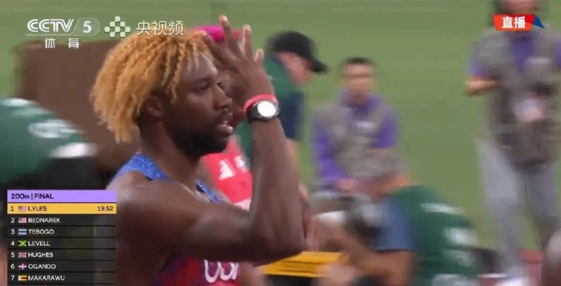 莱尔斯就赢在后程的强大能力上。 这次美国人终于报了在100米上输给两位牙买加人的一箭之仇,在200米比赛中是两位美国人赢了一位牙买加人。而奥运会冠军特博格虽然跑出了这个赛季最好的19秒65,但还没有办法登上领奖台。 这就是男子200米的决赛,莱尔斯比了一个“4”的字样,意味着他已经4次登顶世锦赛冠军,但19秒52的成绩,离博尔特的19秒19,还是差太远了。随着年纪的增加,博尔特的19秒19将离莱尔斯越来越远。