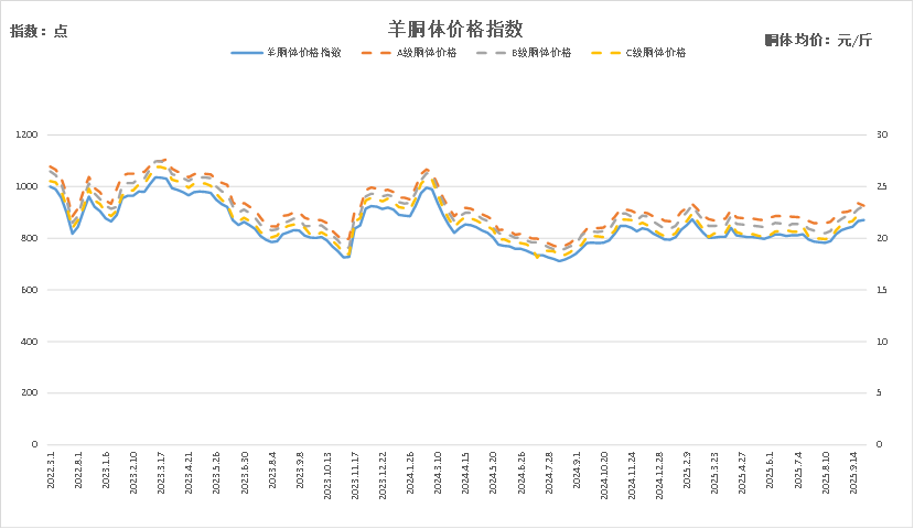 9月14日,怀仁羊胴体价格指数报870.66点,较上期上涨0.49%,A级胴体价格报23.16元/斤,较上期下跌0.23元/斤,跌幅0.97%;B级胴体价格报23.13元/斤,较上期上涨0.31元/斤,涨幅1.35%;C级胴体价格报22.48元/斤,较上期上涨0.20元/斤,涨幅0.88%。
