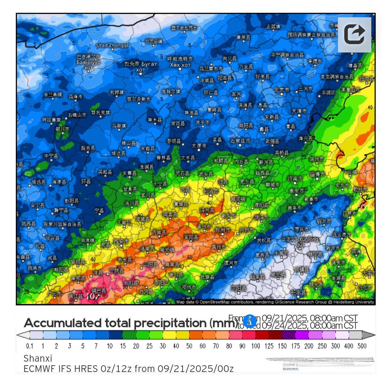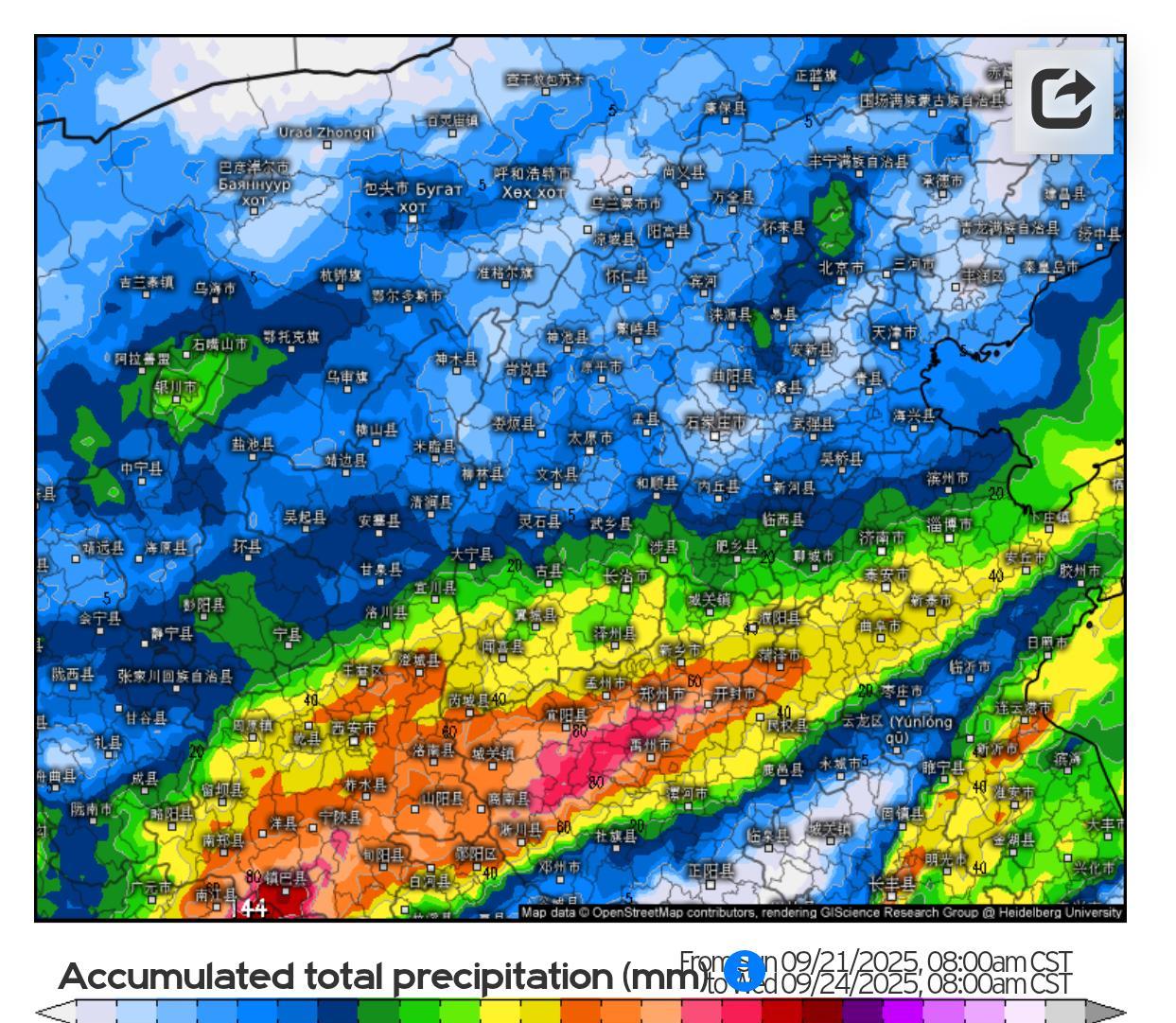 受到上游东移的高空槽影响,新一轮秋雨过程正在如火如荼地进行中。不过目前看雷达回波图,降水回波的位置有所较预期偏北,主力集中在山西中南部河南北部以及河北南部等地,黄橙色回波为主,雨势和缓,主要还是中层暖湿气流沿着底层冷垫滑升所致。今后三天,主雨带逐步东移南压,从川盆至陕南黄淮西部等地有持续性降雨活动,局部累计量级仍可达50-100mm左右