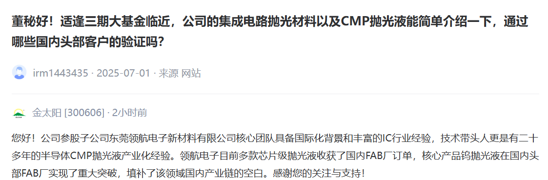 上证报中国证券网讯金太阳22日在互动平台上回答投资者提问时表示,公司参股子公司东莞领航电子新材料目前多款芯片级抛光液收获了国内FAB厂订单,核心产品钨抛光液在国内头部FAB厂实现了重大突破,填补了该领域国内产业链的空白。