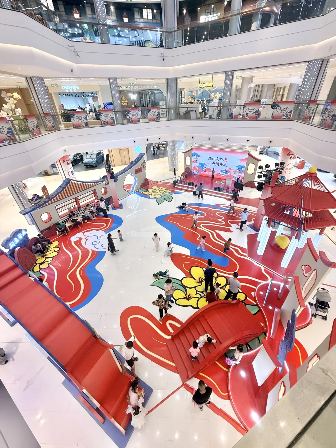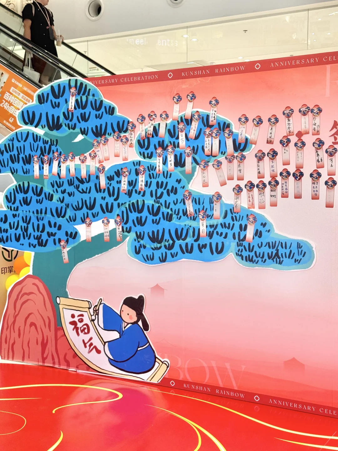 1️⃣ 分享有礼:打卡水墨游园场景,发指定平台带话题 昆山天虹4周年庆 并2️⃣ 集章有礼:用1积分兑换集章卡,完成任务就能换好东西!