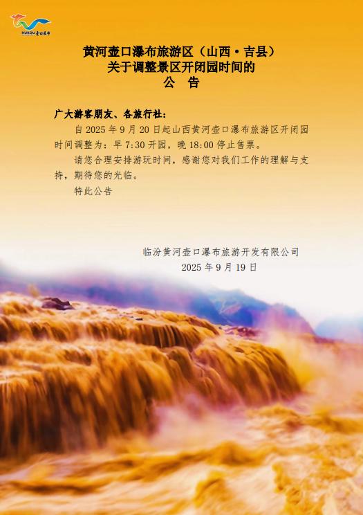 黄河壶口瀑布旅游区(山西·吉县)关于调整景区开闭园时间的公告