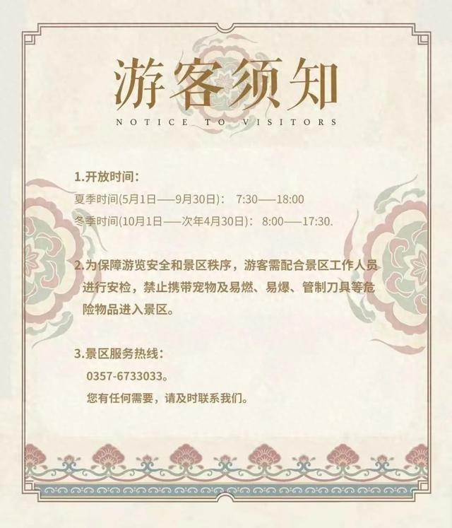 景区设票务咨询处,若您在预约购票过程中有任何疑问或遇到困难,均可致电景区客服电话(0357-6733033)咨询。“国庆”期间景区暂不接待团队游客,请各旅行社调整时间,错峰出行。