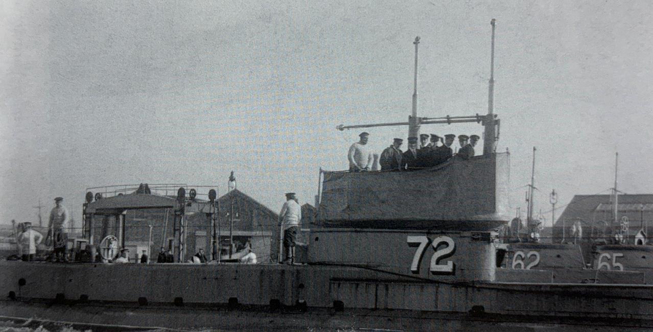 1911年11月6日丘吉尔(右二)在朴茨茅斯港潜艇D-2指挥塔上