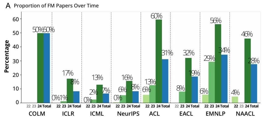 尤其在 NLP 领域,这一趋势更为明显。在 COLM、EMNLP 和 ACL 等专业会议上,基础模型论文的比例甚至超过了 ICLR、ICML 和 NeurIPS 等综合性机器学习会议。