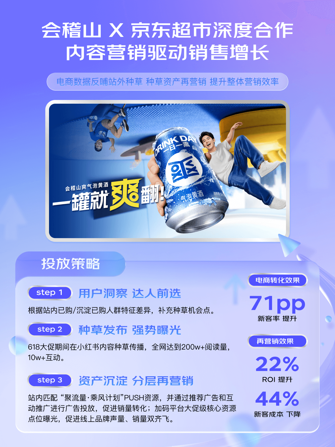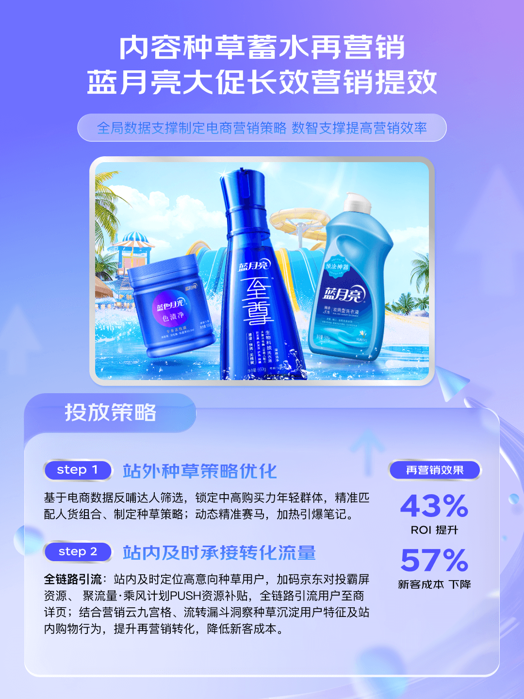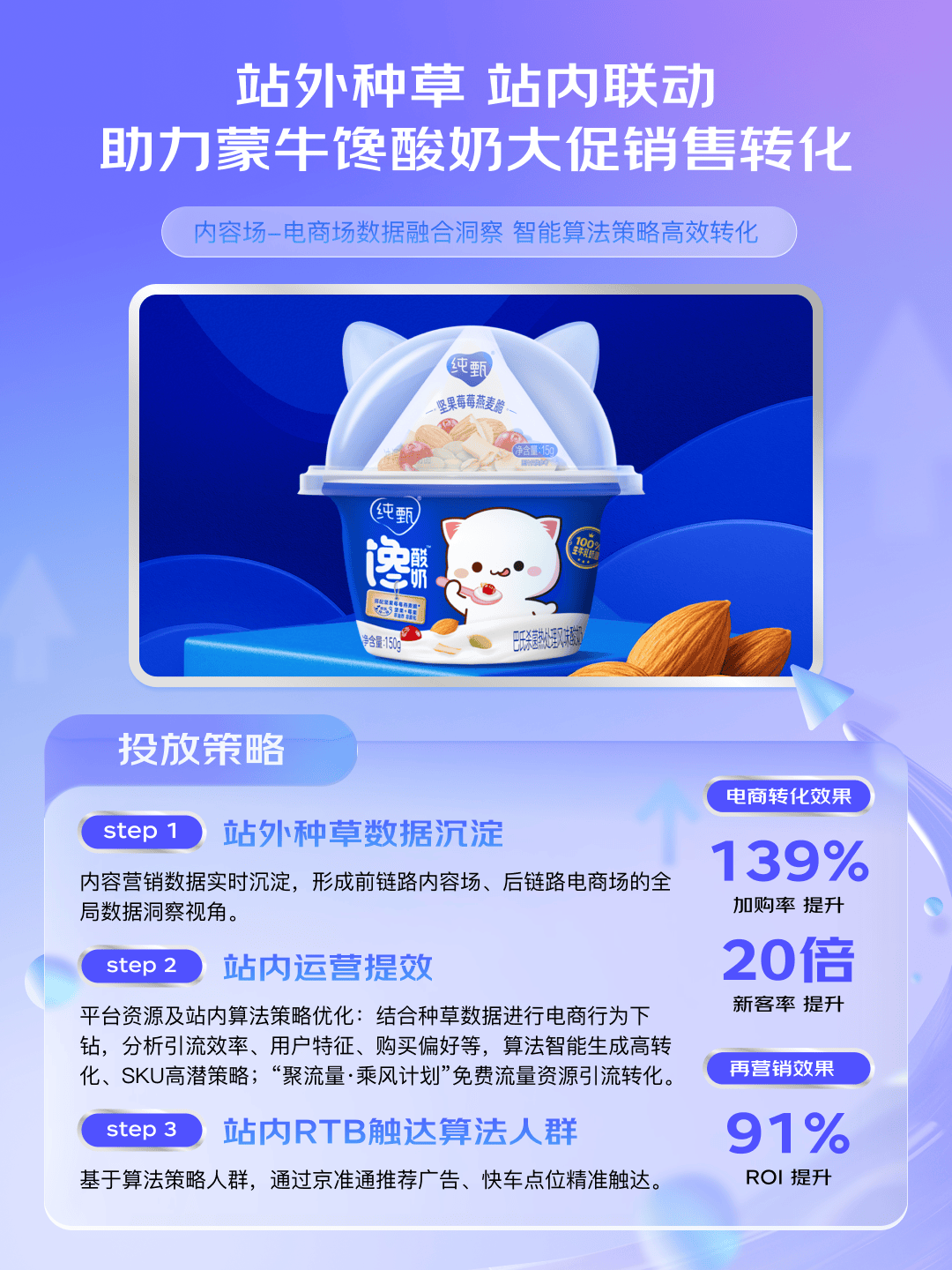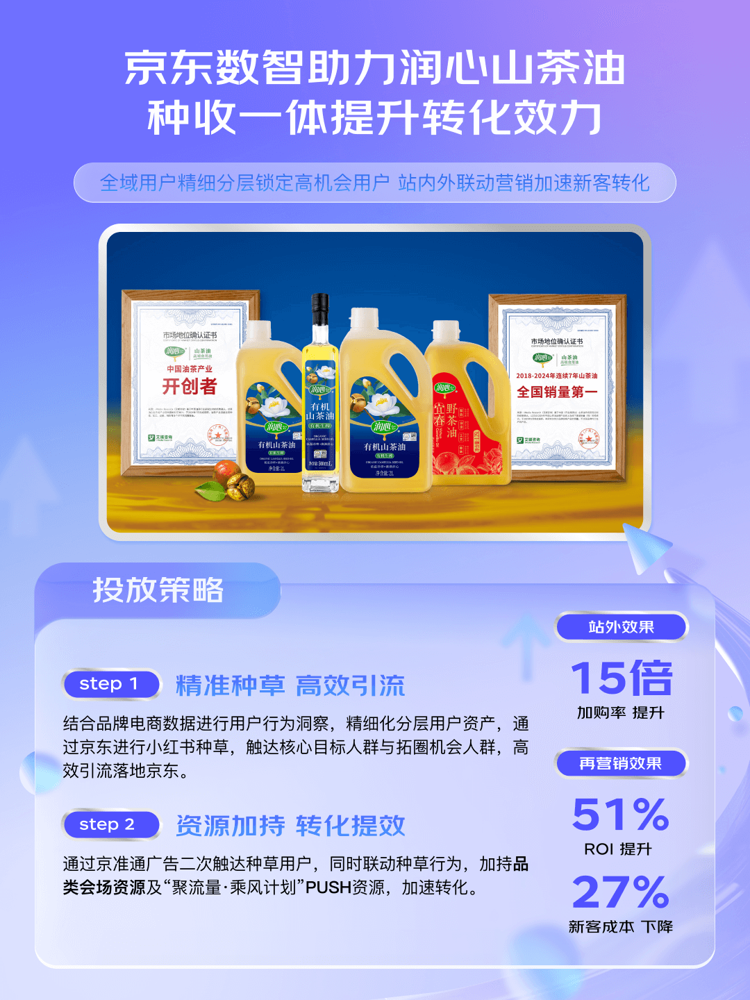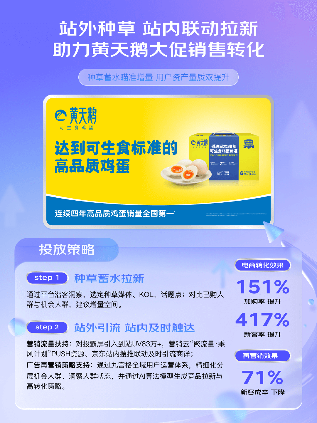 3.闭环转化:通过营销云工具及时沉淀高质量种草数据资产至京东,借力“聚流量·乘风计划”平台流量资源,联动京准通广告二次触达种草用户,多场景精准转化。