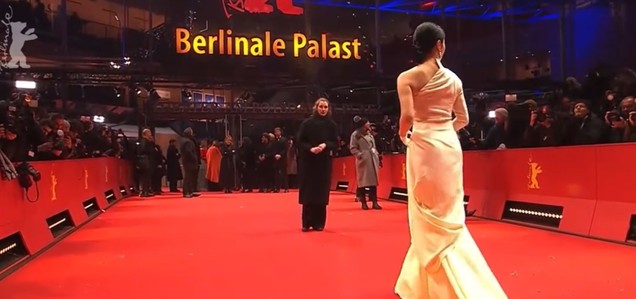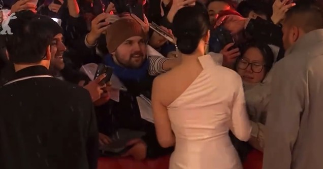 从现场的照片来看,当时柏林电影节的天气非常寒冷,地面已经覆盖上了一层厚厚的积雪,举办这种活动之前,主办方肯定会打扫清理地面的,而如今这才没多久,地面就又覆盖上了这么多积雪。