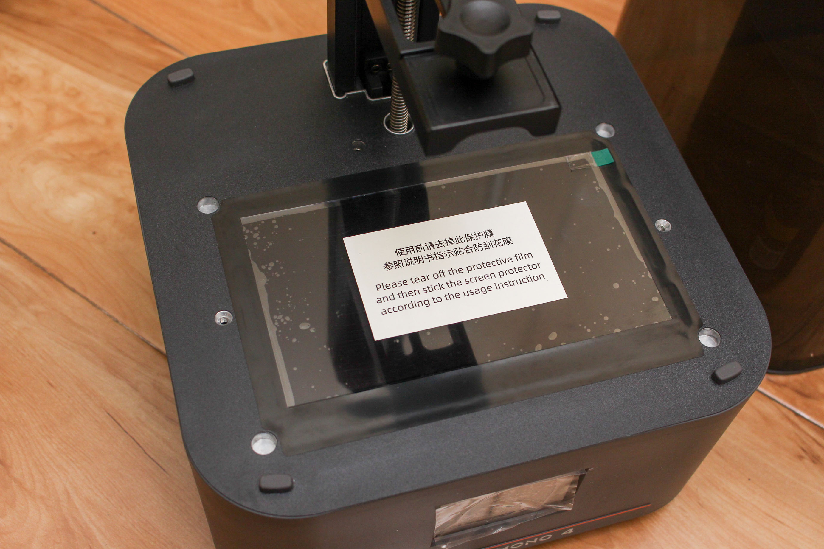 贴有保护膜的部分就是光固化打印机的核心部件曝光屏,这块7寸单色液晶屏贴有保护膜,按照说明书提示这个表面的膜需要撕去贴上包装中附送的防刮花膜。