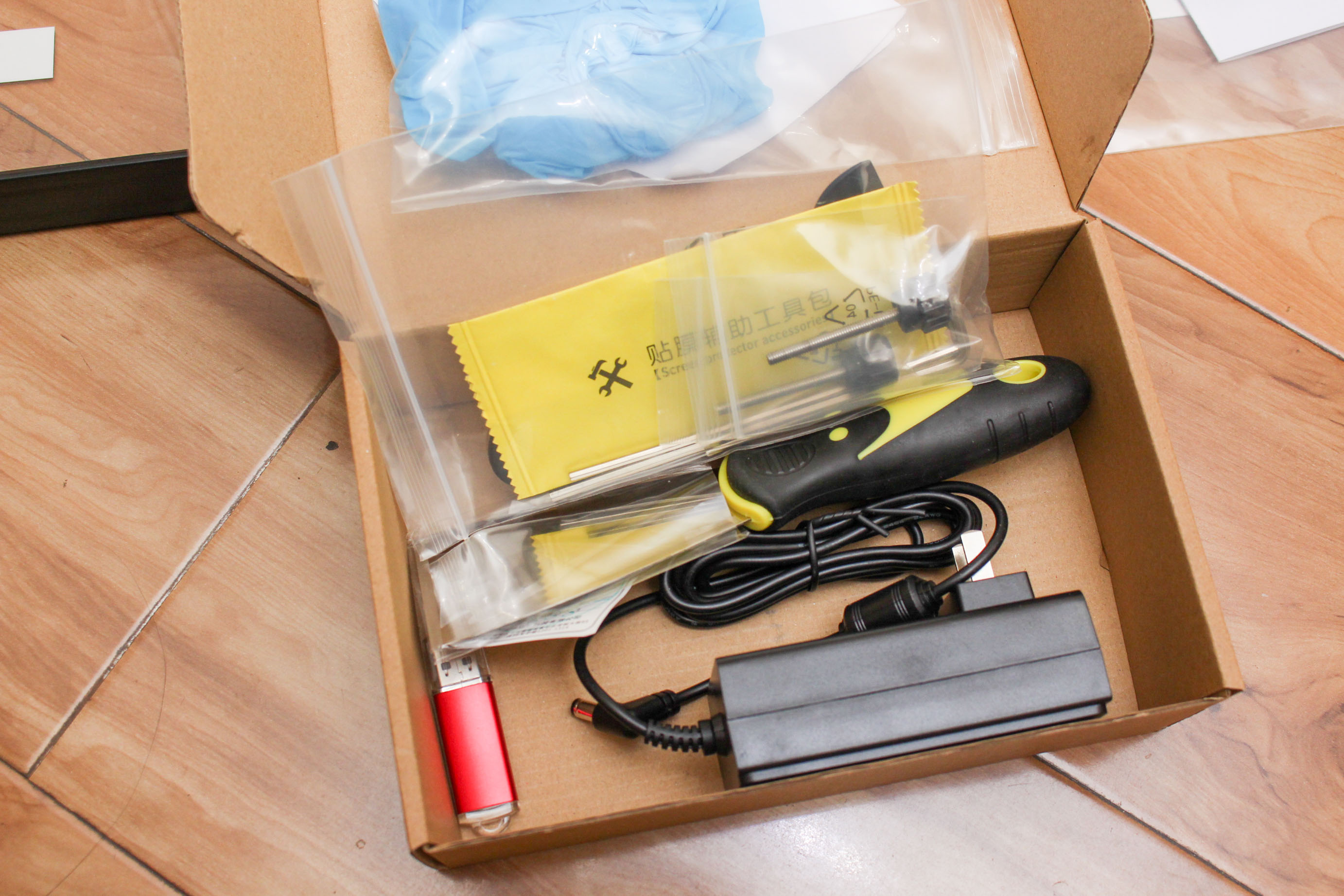 其他配件放在了这个小巧的纸盒里,包括一把金属铲刀和一把塑料铲刀、料槽固定的螺丝、包含了切片软件和测试打印件的U盘、电源适配器还有手套滤网等。