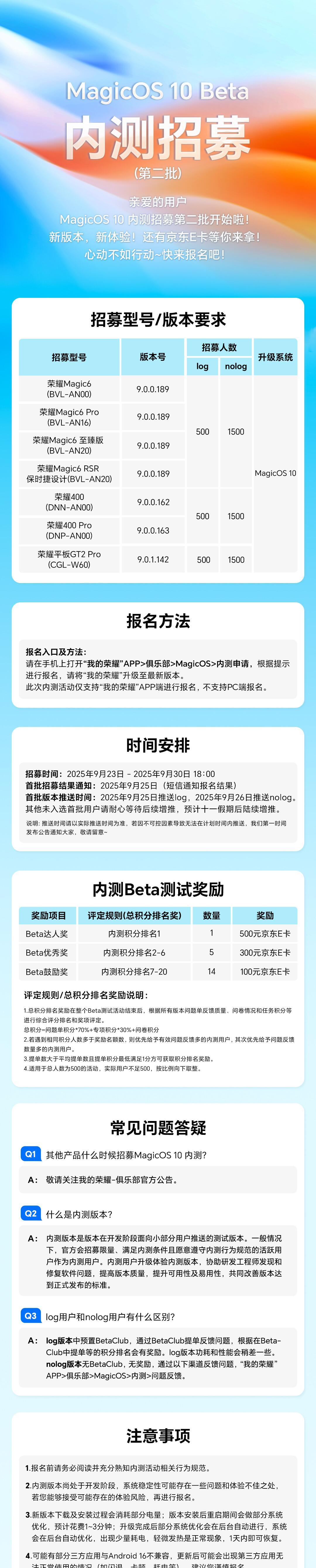 荣耀MagicOS 10第二批机型内测招募开始了,包括荣耀Magic 6系列,荣耀400系列,荣耀平板GT2 Pro