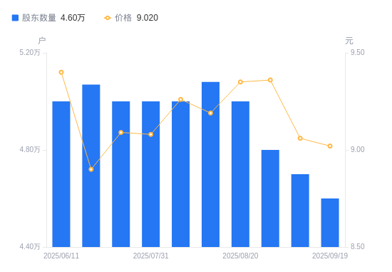 近一年(2024年9月30日至2025年9月19日),荃银高科A股股东户数从4.17万户,增加至4.6万户,增幅10.19%,区间股价上涨29.60%。