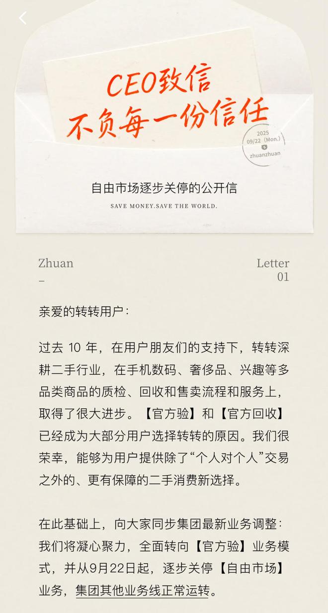 9月22日,转转集团官方宣布,将逐渐关停旗下“自由市场”,即C2C业务,转而全力聚焦二手“官方验”业务模式。这个曾让转转起家的业务,最终以GMV占比不足3%的姿态谢幕。