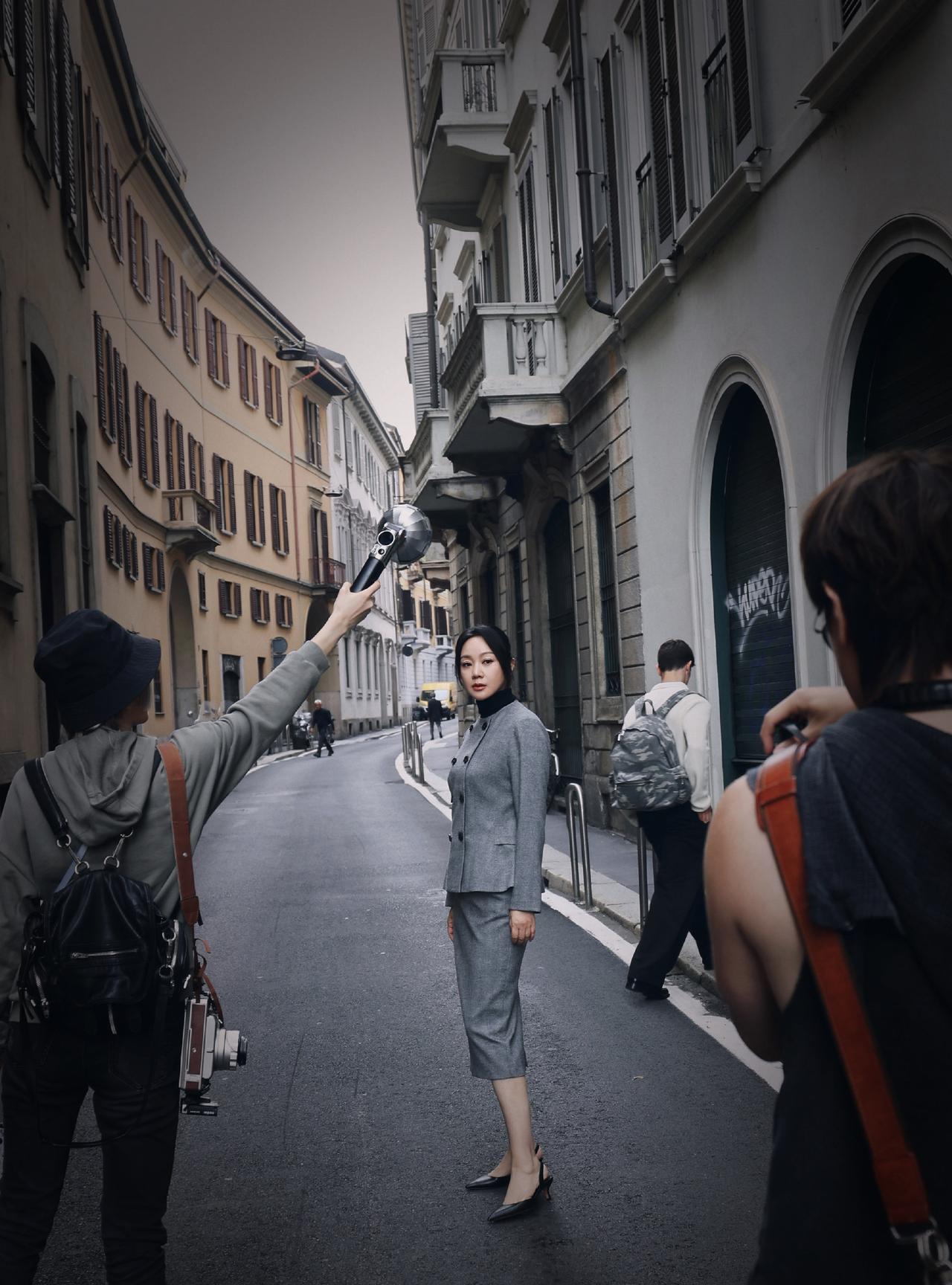 闫妮一身剪裁利落的灰色西装套裙,搭配简约盘发,把职场女性的干练与优雅揉得恰到好处