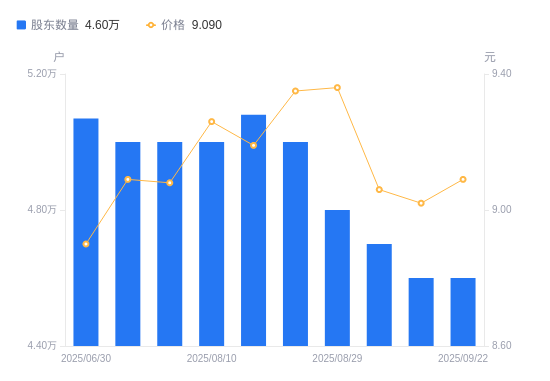 日期A股户数(户)流通A股户均持股数(股)户均持股市值(万元)2025-09-234600019471.1417.952025-09-224600019471.1417.702025-09-194600019471.1417.562025-09-104700019056.8617.272025-08-294800018659.8517.472025-08-205000017913.4516.752025-08-155080017631.3516.202025-08-105000017913.4516.592025-07-315000017913.4516.272025-07-105000017913.4516.28