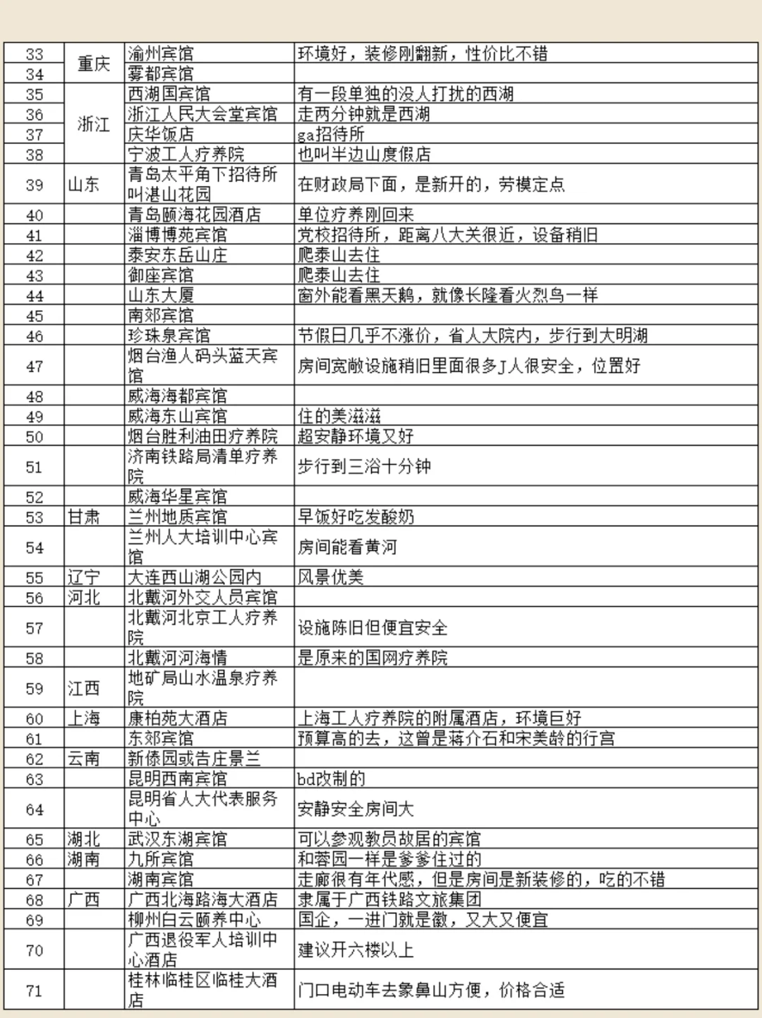 丰俭由人。既有2k的上海东郊宾馆(之前宋美龄行宫)、西湖国宾馆(有单独一段无人打扰的西湖),也有几十块的北戴河干休所(节假日100多)。既有房间能看黄河的兰州人大培训中心宾馆、能看黑天鹅的山东大厦,也有免费参观教员故居的武汉东湖宾馆,还有适合爬泰山的东岳山庄及御座宾馆,怕庐山看星星⭐超清的江西工会疗养院。各有特色,各取所需。
