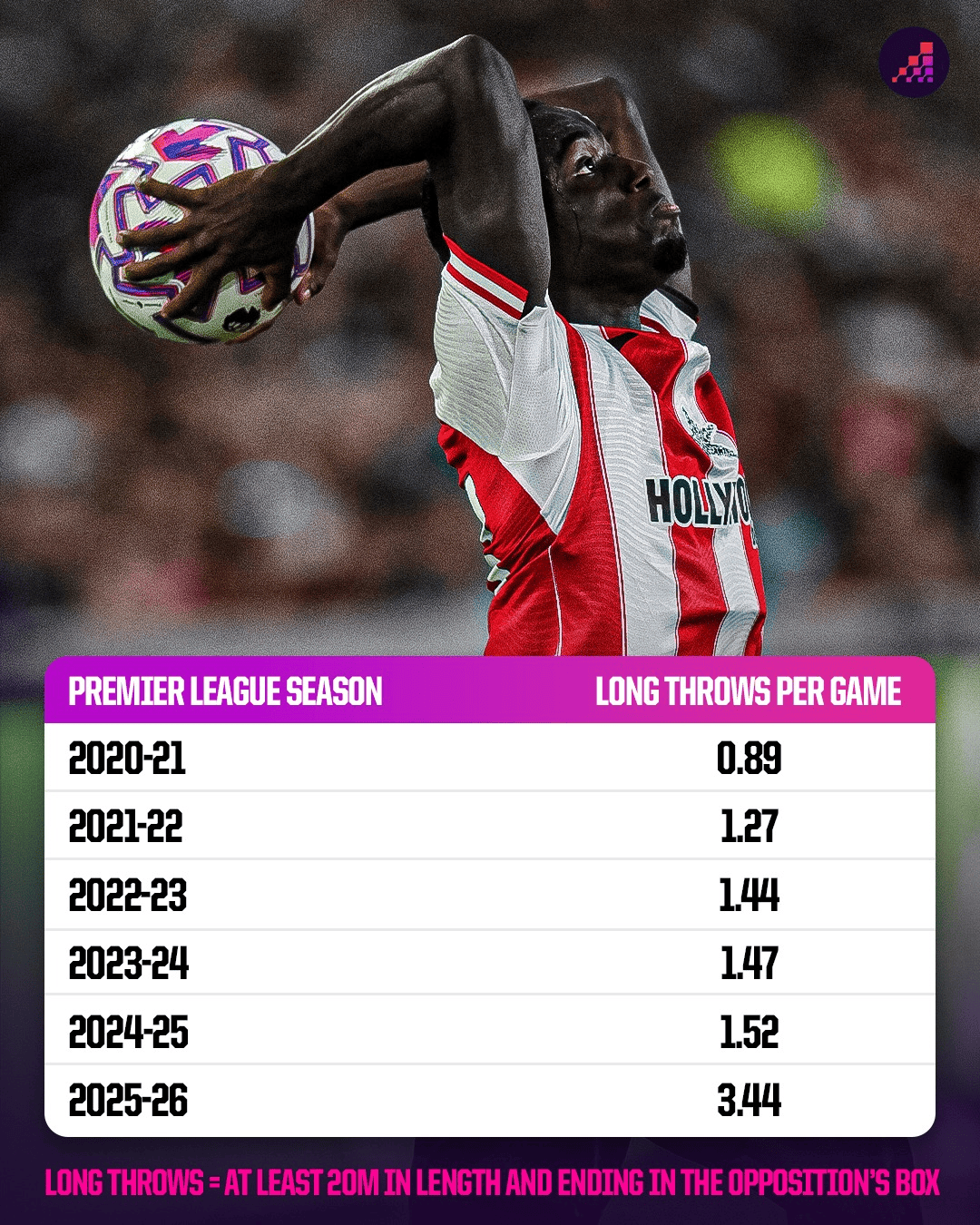 虎扑09月25日讯本赛季英超前五轮,“手榴弹”式边线球(至少掷20米并落入对方禁区)呈现爆发式增长。上赛季场均只有1.52次,而2025-26赛季前50场比赛的数据已经达到3.44次,几乎是上赛季的两倍,也是过去十年中任何赛季都未见过的高位,此前的最高纪录是2018-19赛季的1.67次。