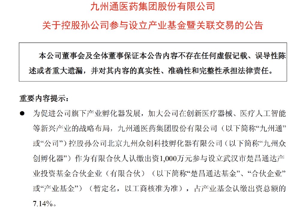 投资界(ID:pedaily2012)9月24日消息,近日,九州通医药发布公告,其控股孙公司北京九州众创科技孵化器有限公司(以下简称“九州众创”)将作为有限合伙人,出资1000万元参与设立武汉市楚昌通达产业投资基金合伙企业(有限合伙)。