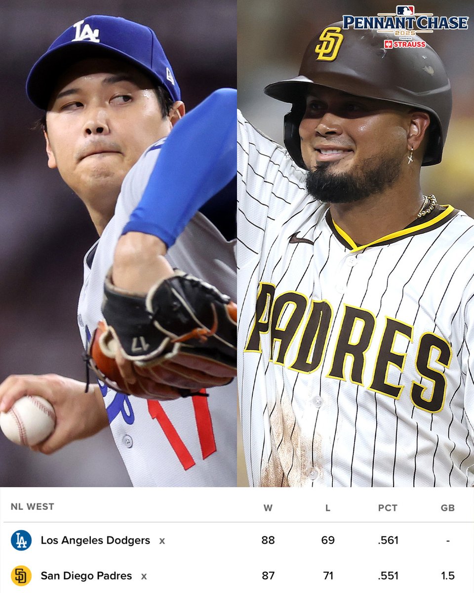 MLB官方X账号发布推文称,道奇队仍掌控着国联西区的主动权,但教士队紧随其后!