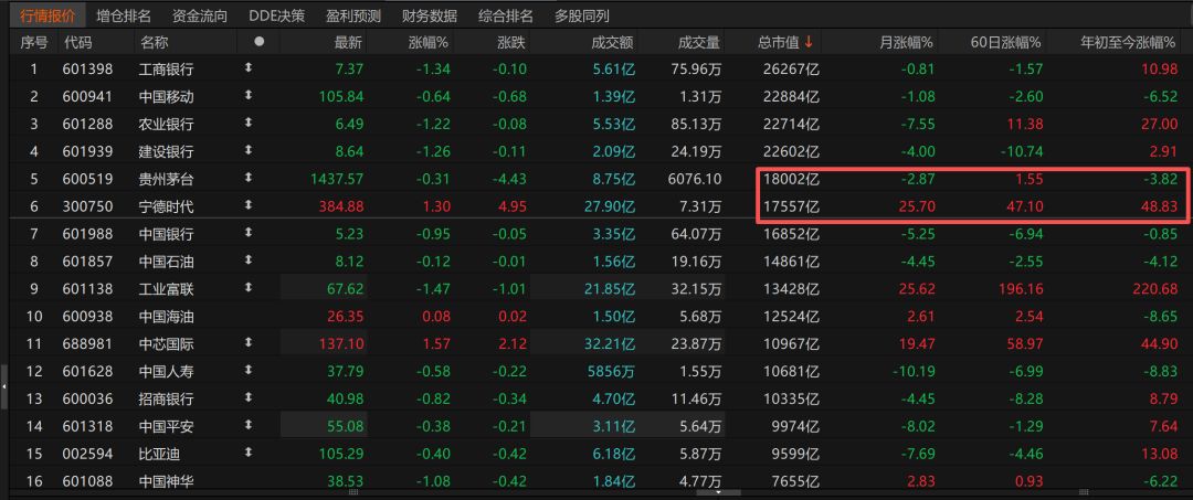 9月25日,贵州茅台股价表现稳定,守住1.80万亿元关口。不过宁德时代开盘后股价涨幅持续扩大,市值从1.75万亿元开始拉升,1.76、1.77、1.78、1.79……最终收盘突破1.80万亿元,市值超越贵州茅台。