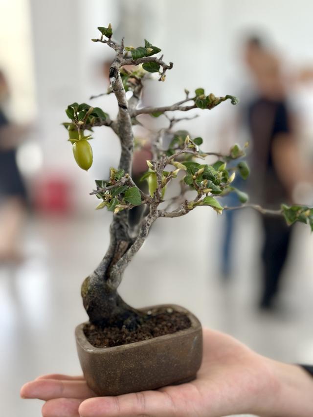 令人眼前一亮的是,一些“掌上盆景”尤为小巧可爱,吸引了很多人驻足。比如一株爬山虎盆景,寸把长、手指粗的藤条探出盆外,上面缀满一颗颗如蓝莓般的果实。整件作品高度也仅有20厘米左右,却将爬山虎自然天成的形态展现得淋漓尽致。“当时正好看到有一段弯的藤条,便将其剪下,用土包裹,四个月左右就能生根。”作者表示。