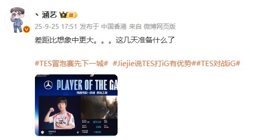 直播吧9月25日讯LPL资格赛TES1-0IG,经纪人涵艺赛后发文:差距比想象中更大。。。这几天准备什么了