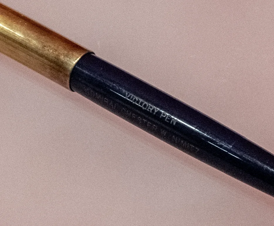 胜利之笔,南京博物院藏。 80年前的今天,1945年9月2日,日本投降签字仪式在美国“密苏里”号军舰上举行,美国海军五星上将切斯特•威廉•尼米兹代表美国签字。这支派克金笔即为尼米兹签字用笔,是旅美华侨胡筠庄所赠,仪式后,尼米兹将笔还赠胡筠庄。笔杆一侧刻尼米兹名“ADMIRAL CHESTER W NIMITZ”,一侧刻 “VICTORY PEN”,“胜利之笔”。“胜利之笔”是世界反法西斯战争胜利的珍贵见证物