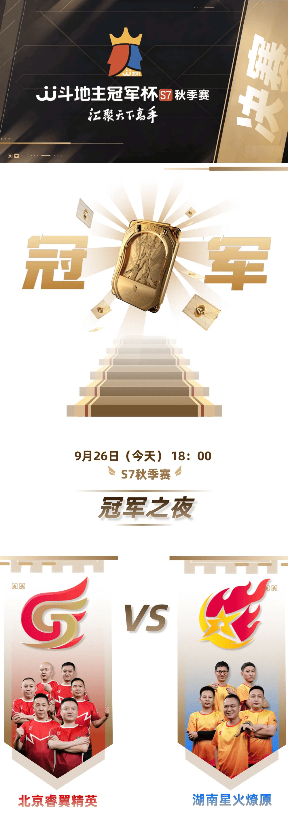 虎扑09月26日讯JJ斗地主S7秋季决赛将于今晚18:00开打,对阵双方是北京睿翼精英vs湖南星火燎原。