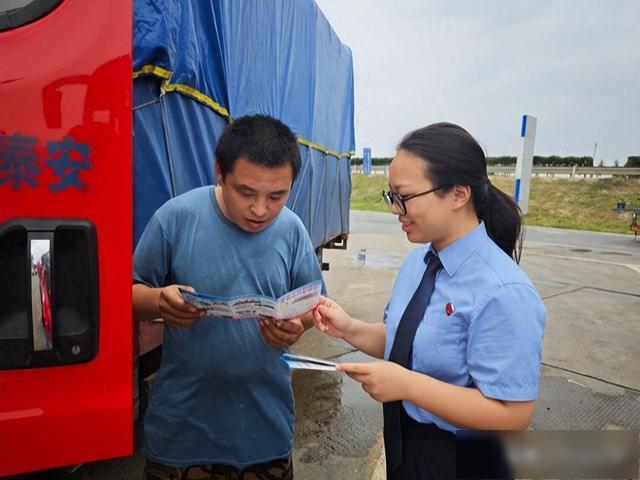 今年9月,湖北省宜城市检察院检察官走进辖区高速服务区,向货车司机发放普法宣传手册。