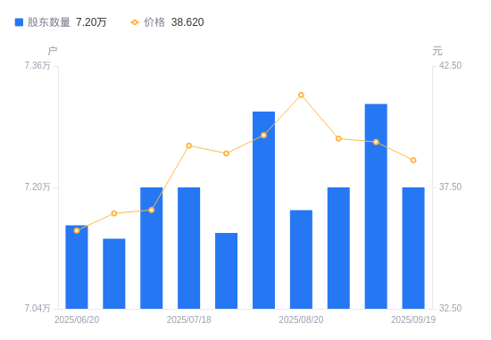 日期A股户数(户)流通A股户均持股数(股)户均持股市值(万元)2025-09-19720006582.8025.422025-09-10731006483.7525.532025-08-31720006581.2226.002025-08-20717006608.7627.302025-08-10730006491.0725.742025-07-31714006636.5225.822025-07-18720006581.2225.812025-07-10720006581.2224.072025-06-30713246643.6024.202025-06-20715006626.8823.67