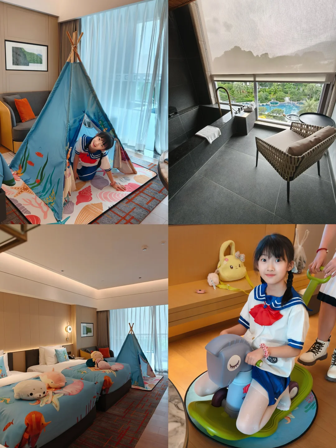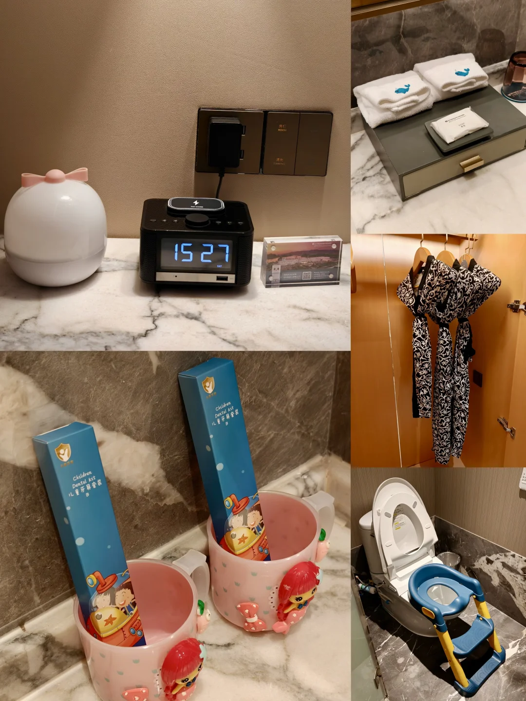 我们订的是【绿色恐龙主题房】,一开门女鹅“哇”出声!房间里不仅有恐龙床品、玩具角,还有小书桌和湖景阳台~儿童洗漱套装(小牙刷+小拖鞋+润肤乳)敲贴心,连老母亲都被萌到!还有芭比、熊猫等6种主题,解决“孩子住到无聊”的问题~