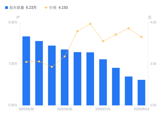 近一年(2024年9月30日至2025年9月19日),ST赛为A股股东户数从7.98万户,减低至6.23万户,降幅21.88%,区间股价下跌7.16%。