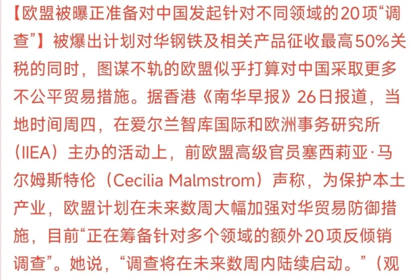 欧盟还是那个欧盟,拿了好处就变脸 欧盟就在19日对华12家公司进行制裁,为了迎合美国的政策,把跟石油有关的公司都给制裁了。这才过去没有几天,就又要对华20项不同领域进行调查。 就在8月欧盟才从中国这里拿到了2582吨的稀土,缓解了欧洲稀土短缺问题,让汽车企业的停产恢复。这才过去一个月就开始对华变脸,主要还是联合美国对中俄施压来完成俄乌冲突的停止。