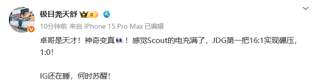[-]卓哥是天才!神奇变真!感觉Scout的电充满了,JDG第一把16:1实现碾压,1:0!