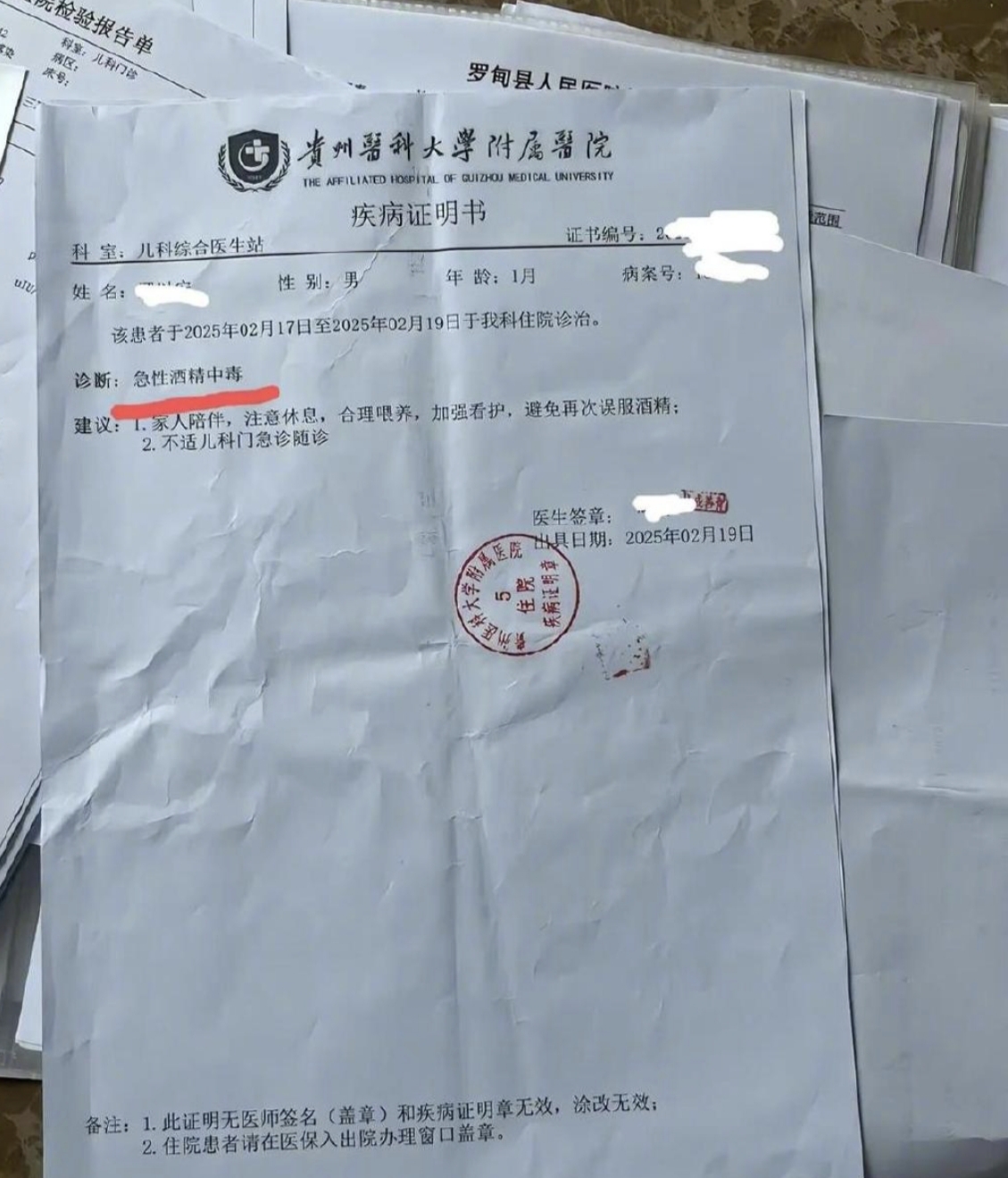 贵州一月大男婴误喝“白酒奶” ,8个月后恢复良好 贵州罗甸县一名刚满月的男婴因奶奶误将桶装白酒当作纯净水冲泡奶粉,喝下120毫升“白酒奶”,险些酿成悲剧。好在及时送医救治,截至2025年9月,孩子已9个月大,恢复情况良好,未出现明显后遗症。 2025年2月的一天,孩子奶奶给刚满月不久的孙子冲奶粉时,误把桶装白酒当成了纯净水,冲好后喂了孩子120毫升。当天中午12点孩子就出现不良反应,但奶奶直到下午4点才告知孩子母亲卢女士。卢女士赶回家后,发现孩子全身泛红、意识昏沉,赶紧送医。 据贵州医科大学附属医院儿科综合医生站出具的疾病证明书显示,孩子入院诊断为急性酒精中毒,经过2月17日至19日的住院治疗后康复出院。院方也证实了此次事件的真实性,但具体恢复情况建议联系家属。 如今孩子已9个月大,卢女士表示孩子情况挺好的。经历这次危机后,卢女士决定自己带孩子,以防类似风险再次发生。 这起事件也给所有家长和看护人提了醒,家中白酒、洗涤剂等危险液体要和饮用水分开存放并贴好标签。看护人发现孩子异常得第一时间告知父母,不管是长辈还是父母都得掌握基本的婴幼儿安全知识,毕竟预防比事后补救更重要。