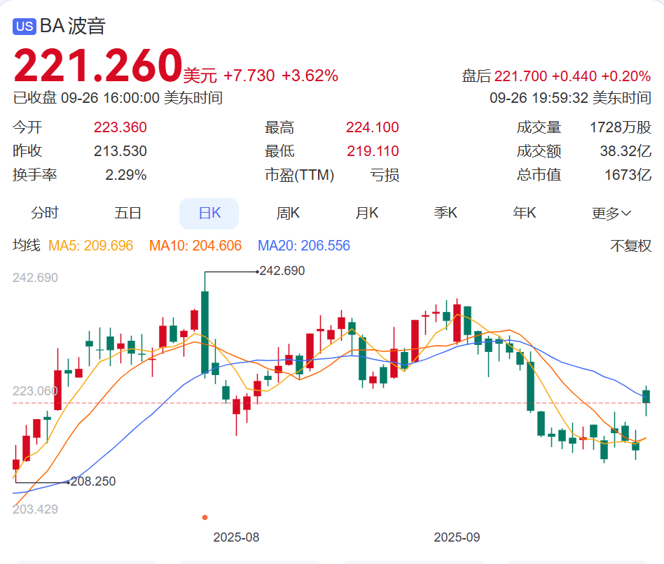 截至9月26日收盘,波音股价大涨,报221.26美元,但距离其2019年的高点已经腰斩。