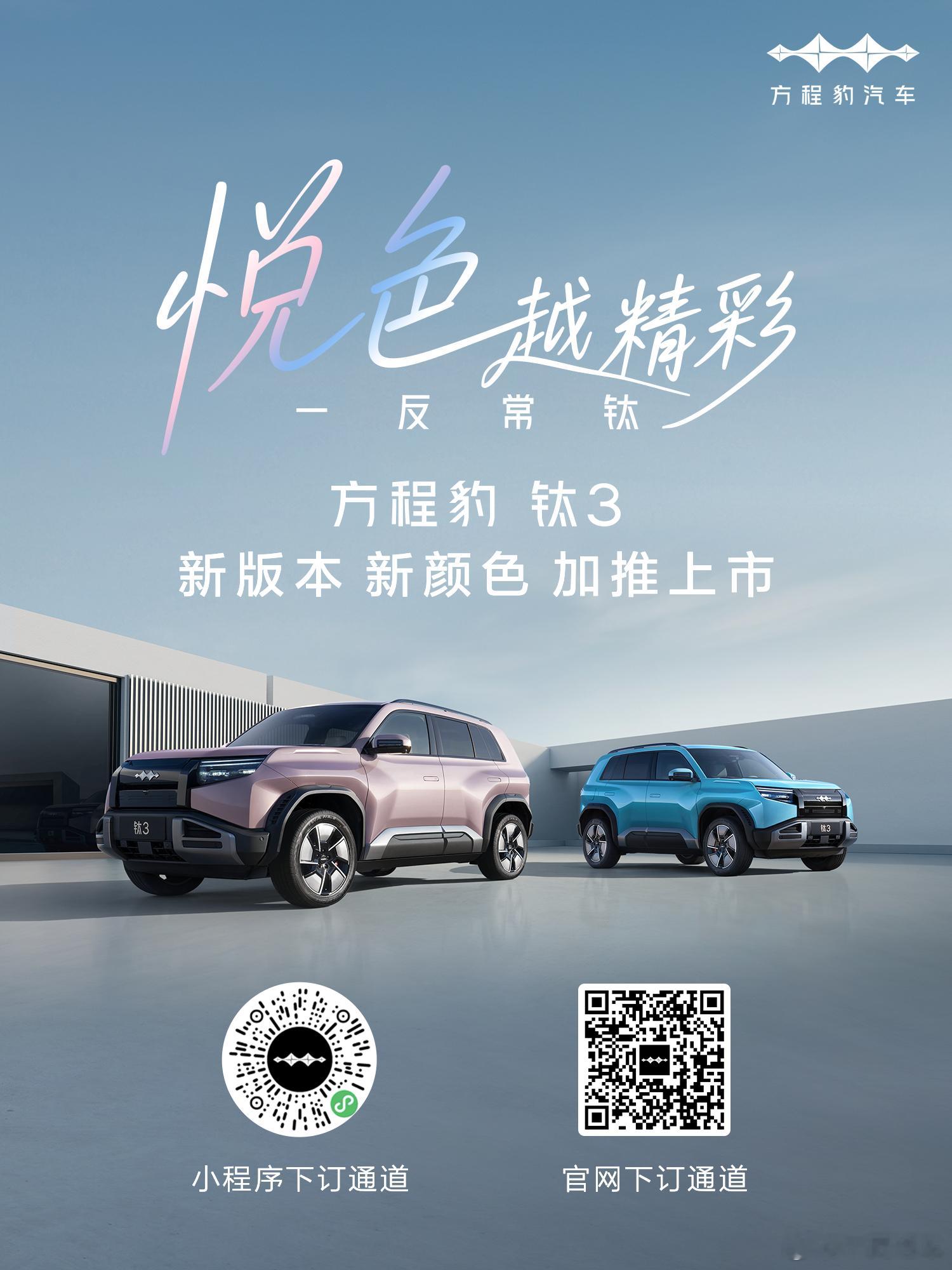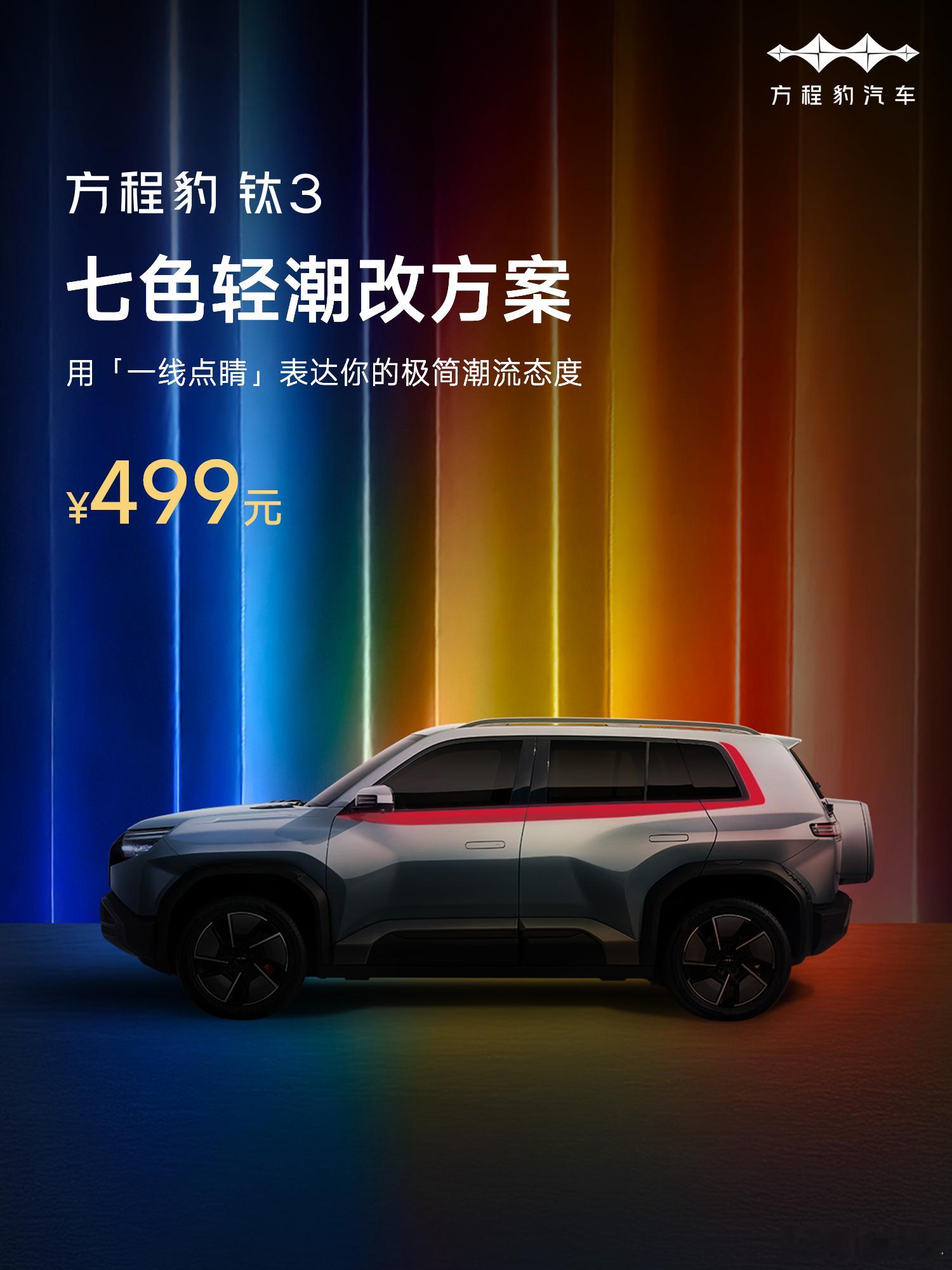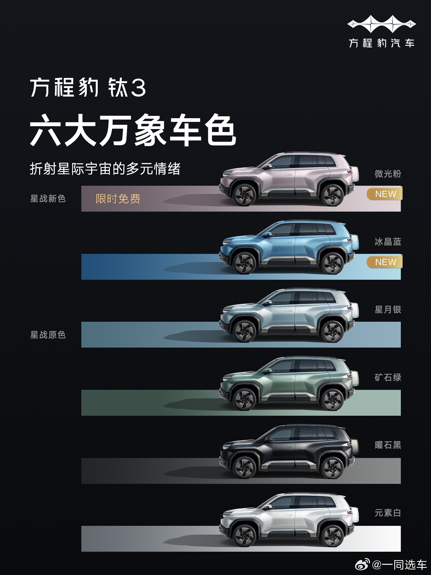 方程豹钛3加推了一个后驱Ultra版,看了下配置,14万的价格性价比相当高。而且还加推了粉蓝两个新颜色,在售是6个版本6种颜色,顶配的无人机版还解绑了无人机,大家可以自由选择,这一波可以说又听劝了,方程豹营销路子对了,以用户为中心不断给更多选择。加上还有多种潮改和变脸方案,相比目前最热的现象级爆款钛7,钛3作为方程豹上半年的爆款,更潮,可玩性更强更高,可以说是A级纯电的不二之选。方程豹钛3钛7