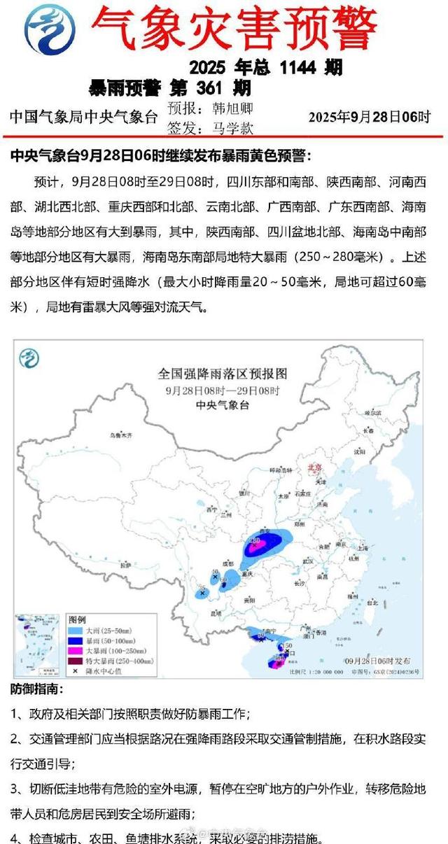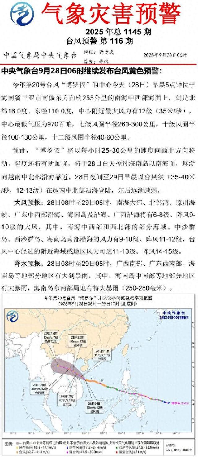 中央气象台9月28日06时继续发布台风黄色预警、暴雨黄色预警。