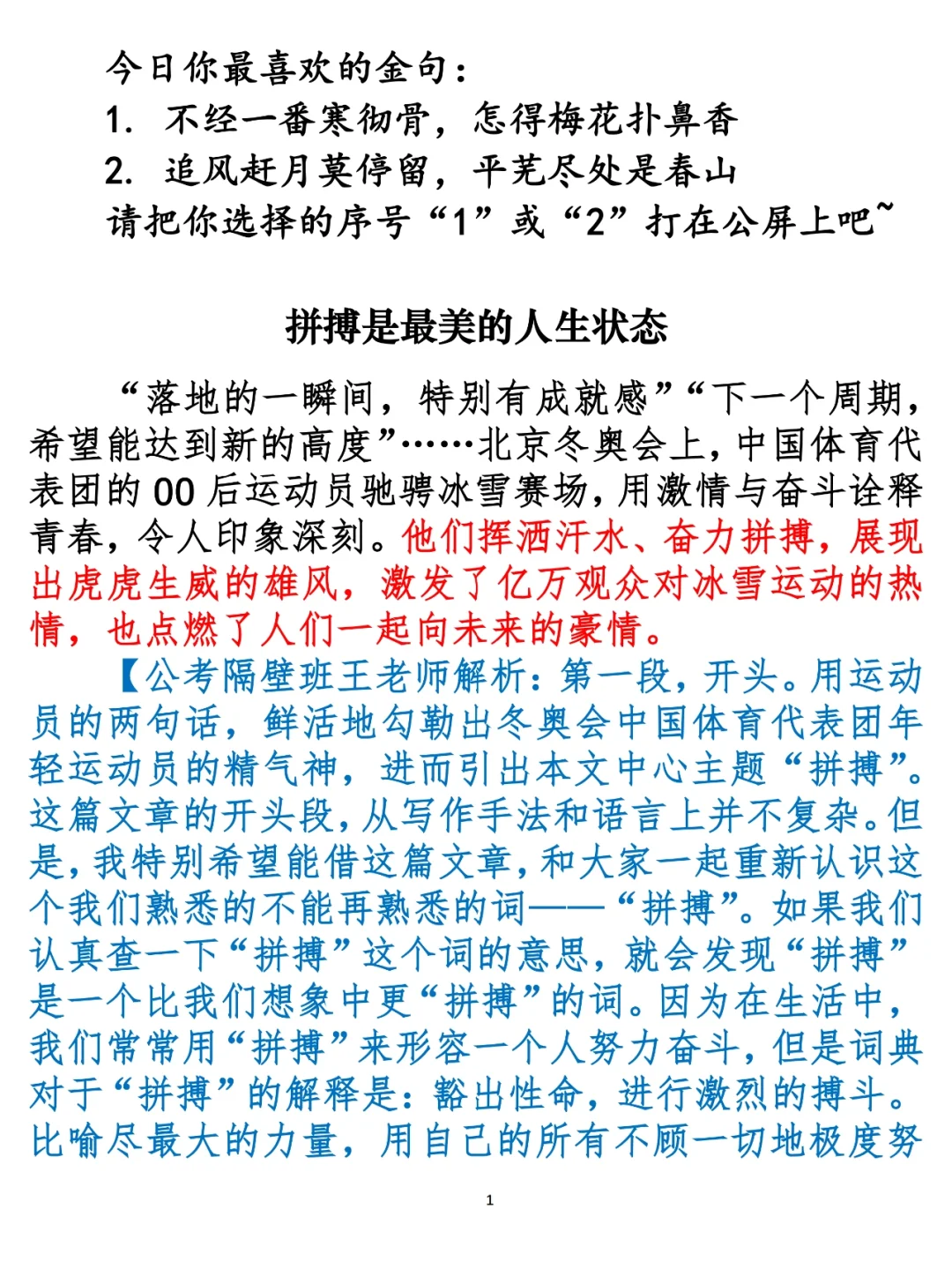 冬奥会闭幕了,朋友圈刷屏了,我们用拼搏赞美冬奥健儿,却未必真懂“拼搏”的意义。今天,我们学习这篇《拼搏是最美的人生状态》,一起读懂拼搏、也读懂人生。 ⭐️ ⭐️ ⭐️ ⭐️ ⭐️ ⭐️ 这里是公老隔壁班王老师独创的“每天半小时 申论80分”抄写团,欢迎加入我们!