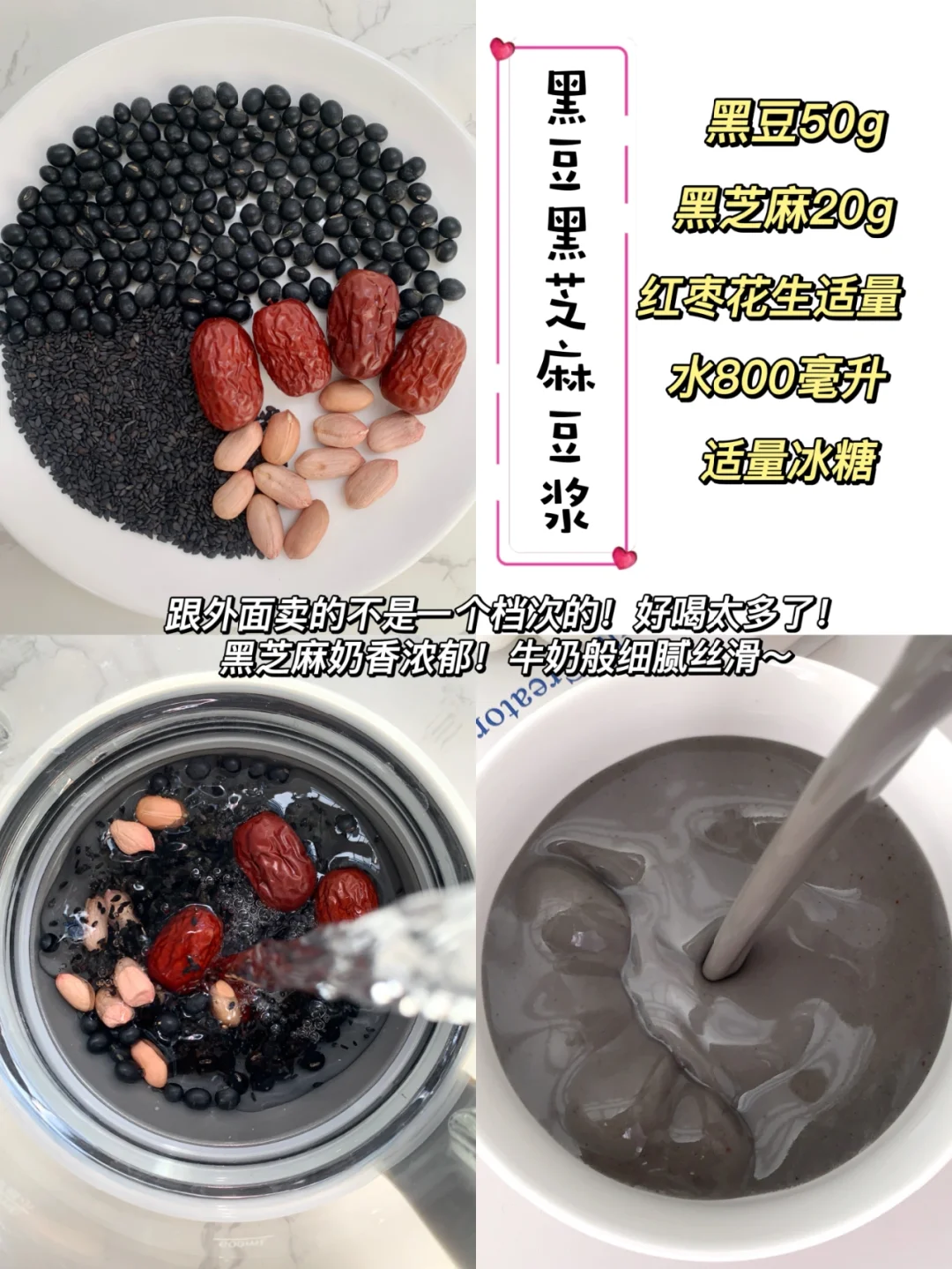 食材:黑豆50g、黑芝麻20g、红枣花生适量、水800毫升、适量冰糖