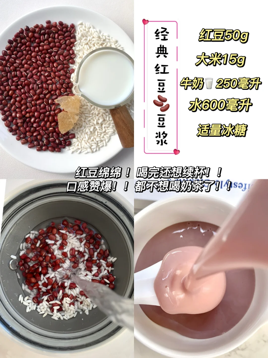 食材:红豆50g、大米15g、牛奶250毫升、水600毫升、适量冰糖