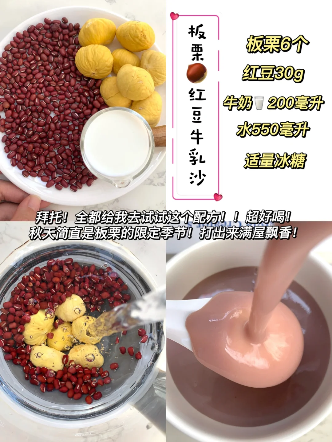 食材:板栗6个、红豆30g、牛奶200毫升、水550毫升、适量冰糖