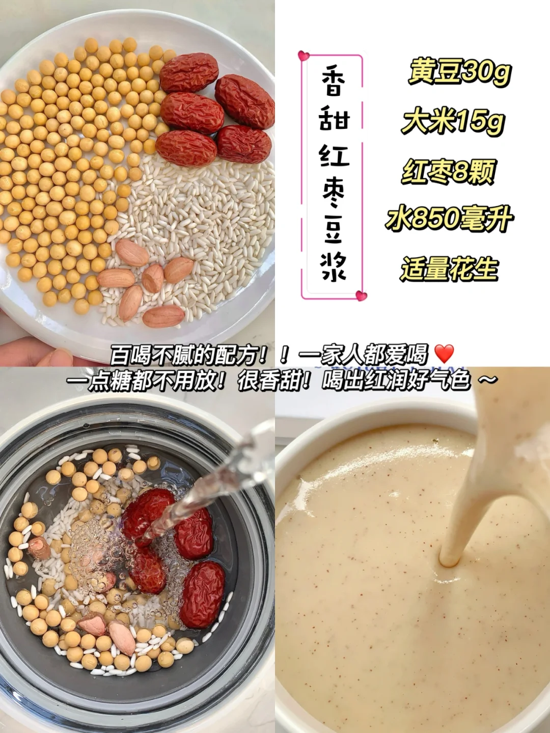 食材:黄豆30g、大米15g、红枣8颗、水850毫升、适量花生