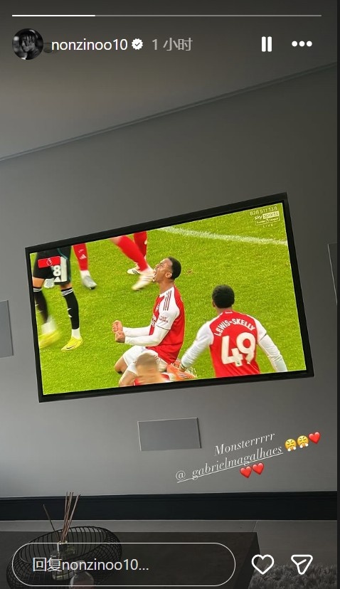 在社交媒体上,马杜埃凯晒出了自己的看球照,电视画面正是加布里埃尔绝杀后的庆祝场面。马杜埃凯称赞道:野兽!!!